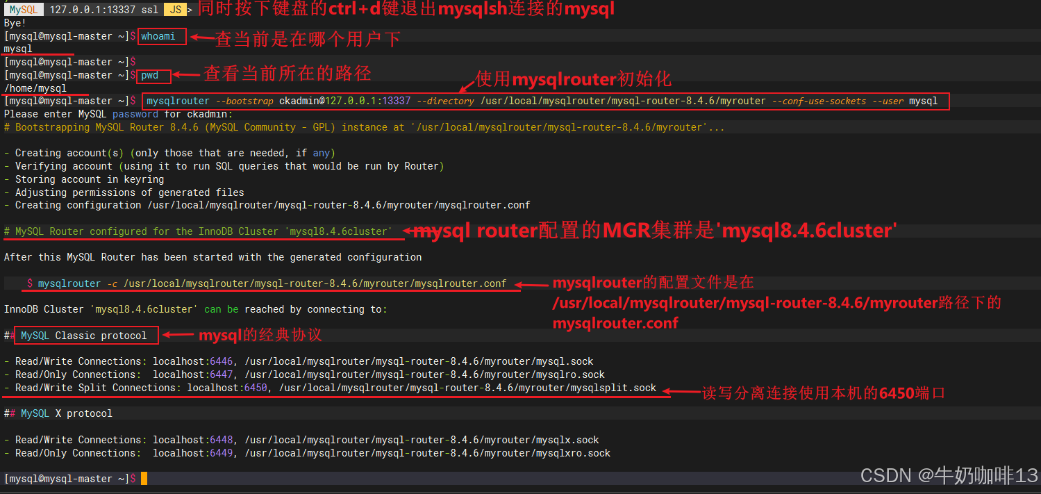 cluster.status();#3.2-查看MGR集群状态成功后退出【按下Ctrl+d】,并切换到mysql用户下重新初始化mysqlrouter