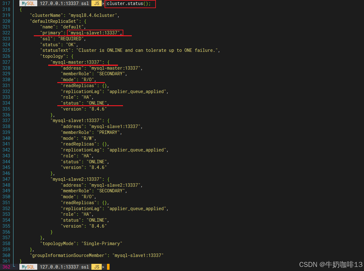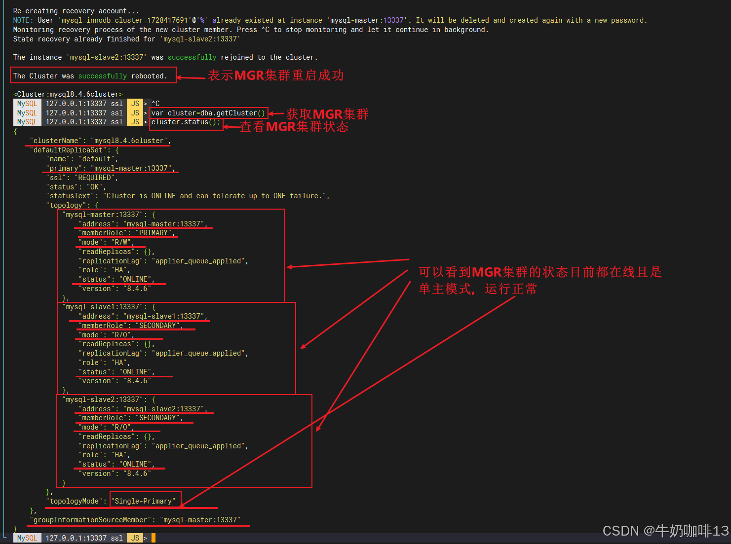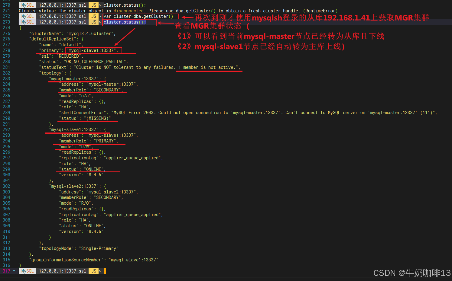 cluster.status();#若要将离线的mysql-master重新加入MGR集群,则只用重启该mysql服务即可(注意:即使该离线的mysql-master节点重新加入后也不会切换为主库了)