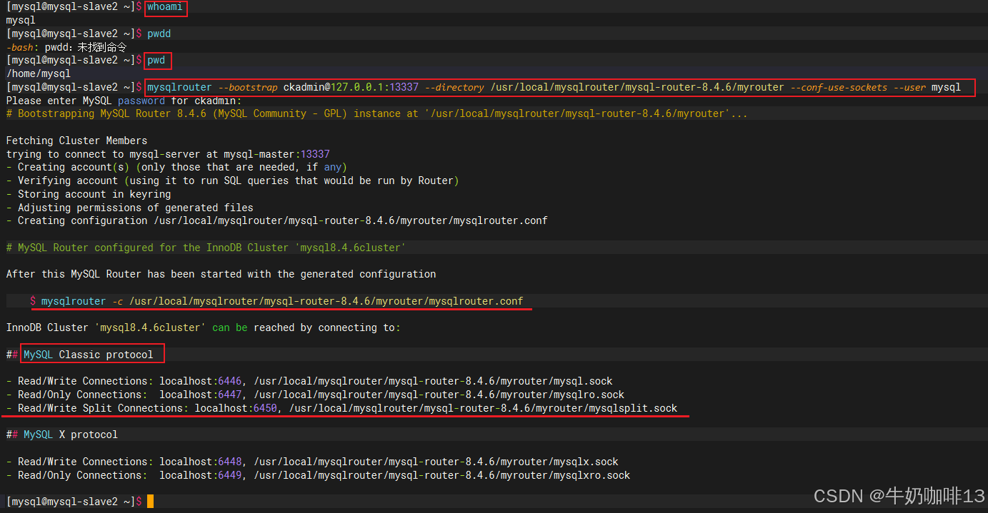 mysqlrouter --bootstrap ckadmin@127.0.0.1:13337 --directory /usr/local/mysqlrouter/mysql-router-8.4.6/myrouter --conf-use-sockets --user mysql#3.1-只在MGR集群的主库(192.168.1.40)切换到mysql用户下使用mysqlsh登录mysql查看MGR集群并重启MGR集群