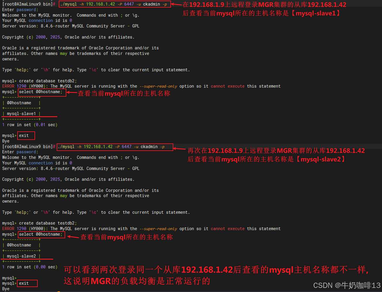 《2》选择任意一个客户端(192.168.1.9)或者程序连接mysql集群任意一个节点(如:192.168.1.42)访问6447端口(只读)后查看当前的主机名称;然后在退出重新登录后再次查看当前的主机名称;可以发现每次登录显示的主机名称是不一样的则体现了负载均衡。