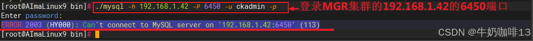 注意:若在任意客户端(如:192.168.1.9)连接MGR集群中的任意节点(如:192.168.1.42)时显示“ERROR 2003 (HY000): Can't connect to MySQL server on '192.168.1.42:6450' (113)”错误,则我们需要检查192.168.1.42的防火应该是没有关闭,则需要放开6450端口。