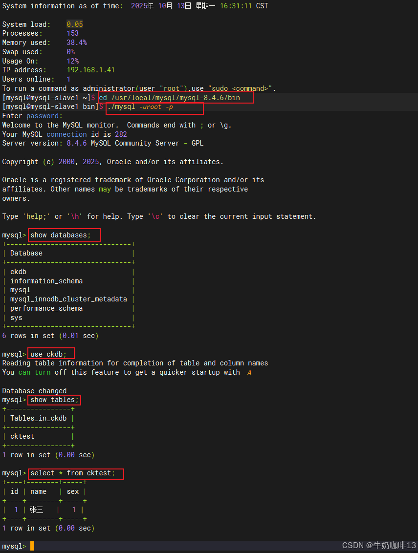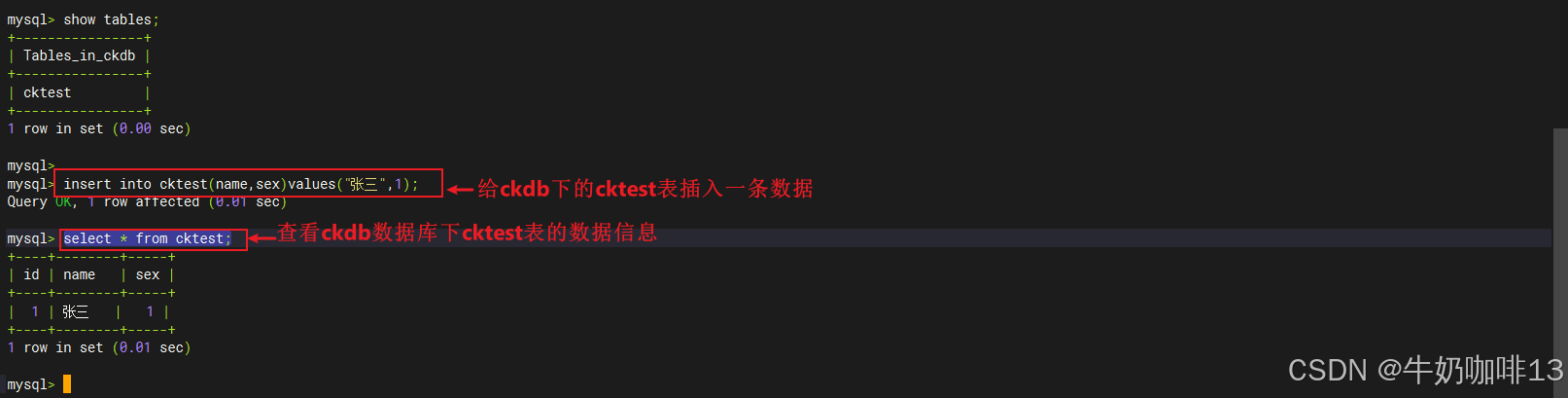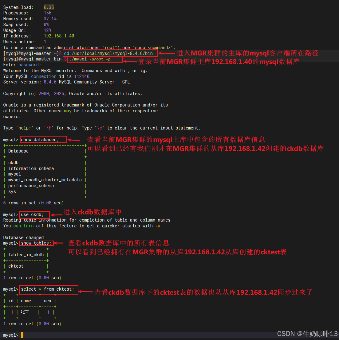 select * from cktest;#2-分别在MGR的主节点(192.168.1.40)和从节点(192.168.1.41)使用root用户登录查看是否有刚创建的ckdb数据库和cktest表和查看cktest表的数据【有该数据库则表示复制同步正常】
