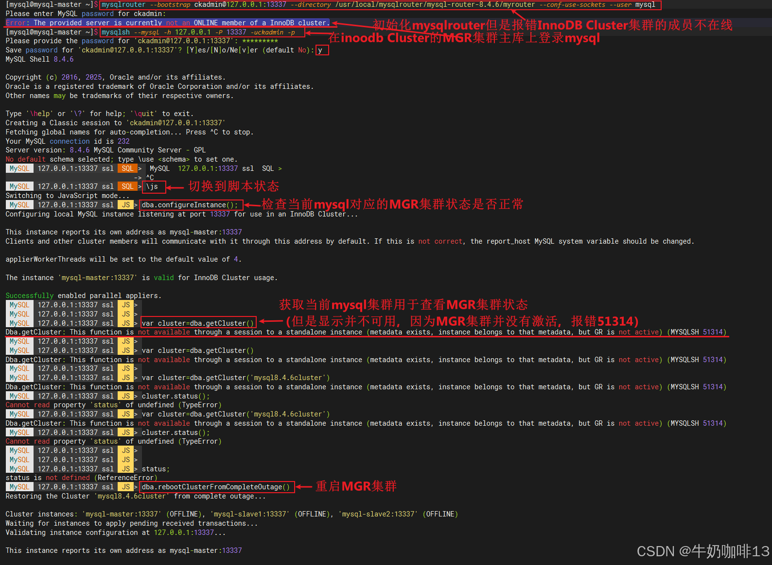 注意:当我们查看MGR集群状态时显示“Dba.getCluster: This function is not available through a session to a standalone instance (metadata exists, instance belongs to that metadata, but GR is not active) (MYSQLSH 51314)”错误时,需要重启集群,重启集群命令是【dba.rebootClusterFromCompleteOutage()】