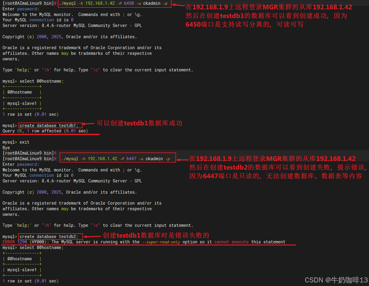 《1》选择任意一个客户端(192.168.1.9)或者程序连接mysql集群任意一个节点(如:192.168.1.42)访问6447端口(只读)后,看是否可以创建数据库、表等操作,不能创建则表示正常;而刚才主从复制同步测试使用的6450端口则是读写分离可以创建数据库、表等操作。