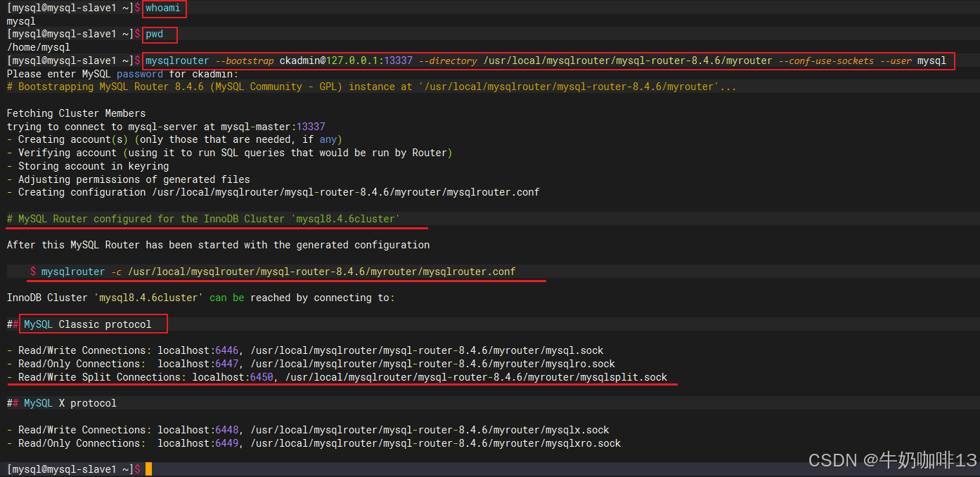 wget https://dev.mysql.com/get/Downloads/MySQL-Router/mysql-router-8.4.6-linux-glibc2.28-x86_64.tar.xz -c o -P /datamkdir -p /usr/local/mysqlroutercd /datatar -xvf mysql-router-8.4.6-linux-glibc2.28-x86_64.tar.xz -C /usr/local/mysqlrouter/cd /usr/local/mysqlrouter/mv mysql-router-8.4.6-linux-glibc2.28-x86_64 mysql-router-8.4.6cd mysql-router-8.4.6/mkdir myrouterchown -R mysql:mysql /usr/local/mysqlrouter#2-切换到mysql用户下,配置mysqlrouter在mysql用户下全局可用