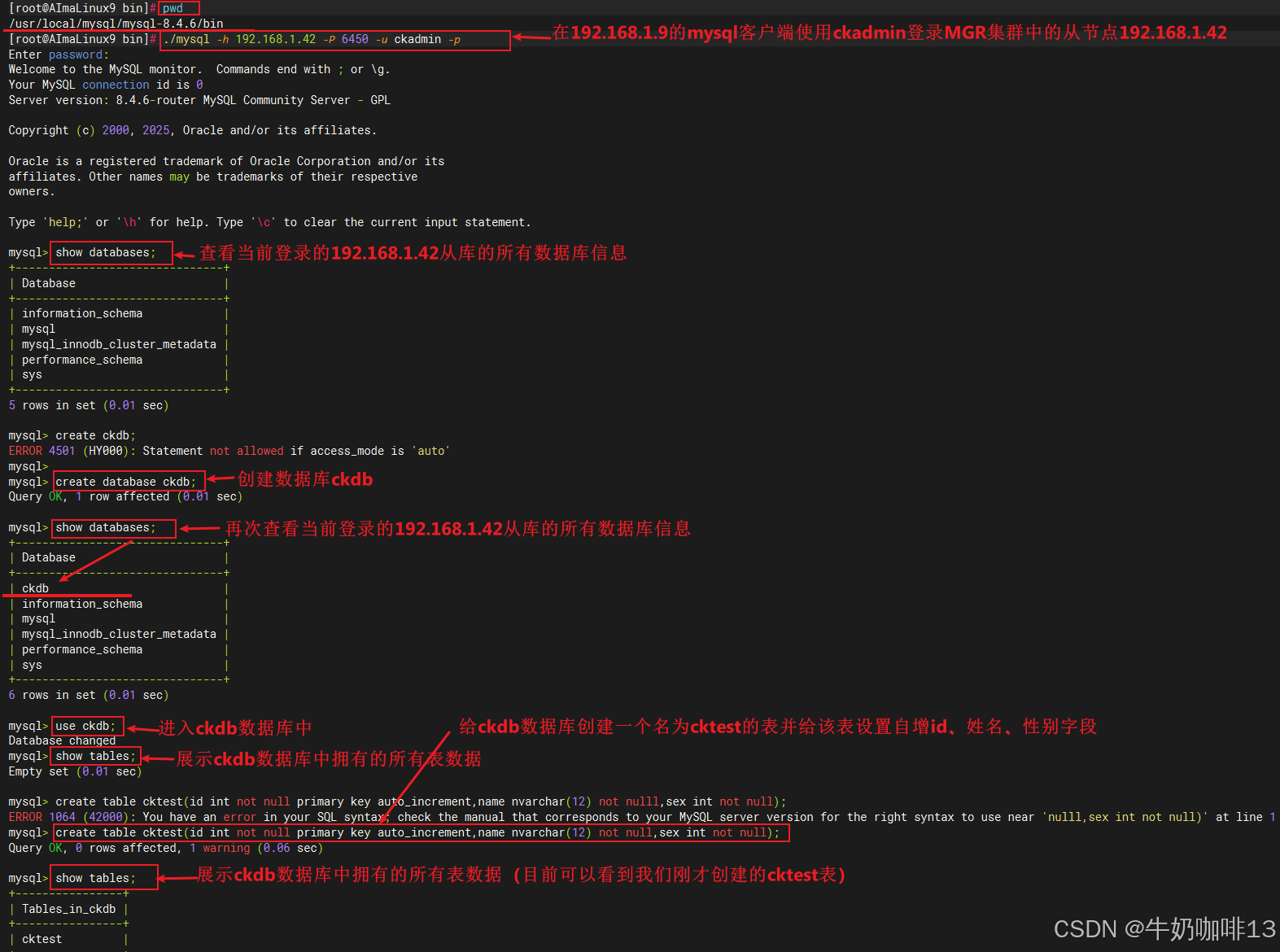 #我们在192.168.1.9的mysql客户端连接MGR集群中的任意节点(如:192.168.1.42)#1-进入192.168.1.9的mysql客户端路径开启连接MGR的(192.168.1.42)创建ckdb数据库及其在该数据库下创建cktest表和给该表插入一条数据