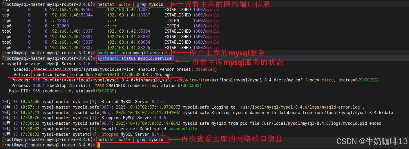 systemctl status mysqld.service#3-回到刚才使用mysqlsh工具登录到的MGR从库再次查看当前集群状态(此时MGR集群中mysql-master(192.168.1.40y)自动切换为从库且下线,而另外的从库mysql-slave1(192.168.1.41)已经切换为主库)