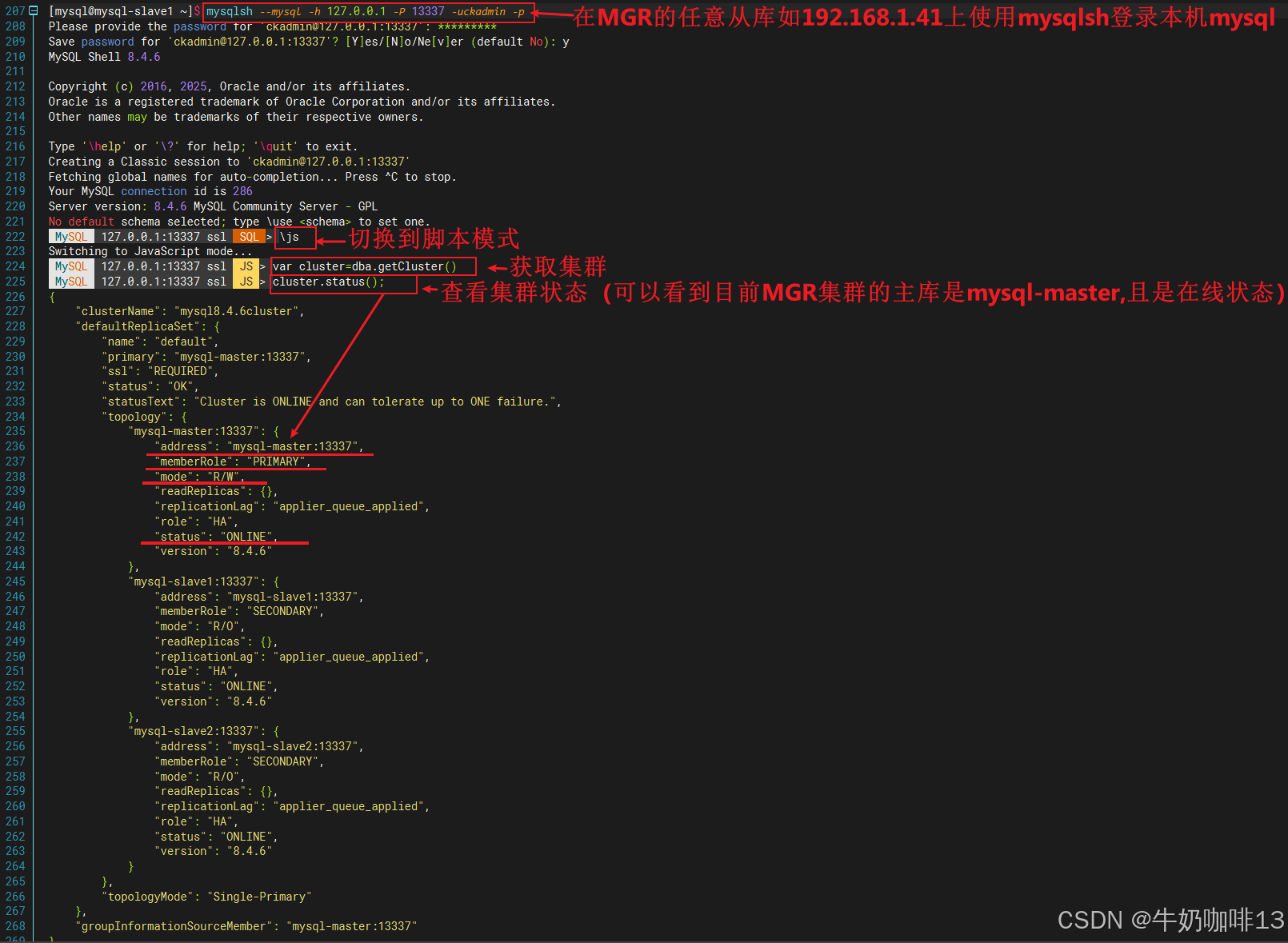 var cluster= dba.createCluster('mysql8.4.6cluster')#4-查看MGR集群状态并添加节点(添加其他节点 192.168.1.41/42,此时会进行数据库克隆,把节点1的数据库复制到其它数据库,同时进行同步)
