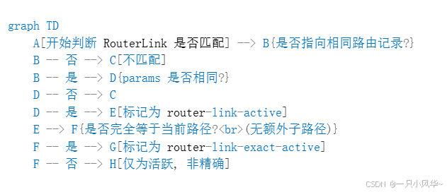 router-link-active | 当前链接是当前路由本身或其祖先路由 | 导航栏中父级菜单高亮 |