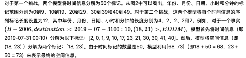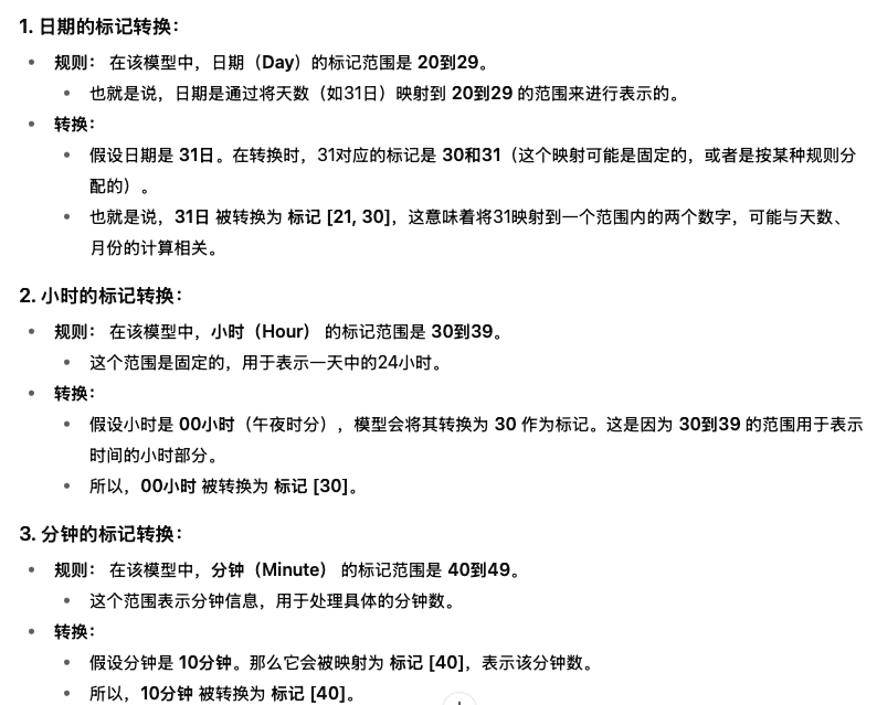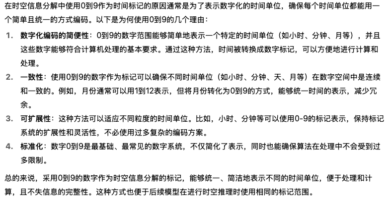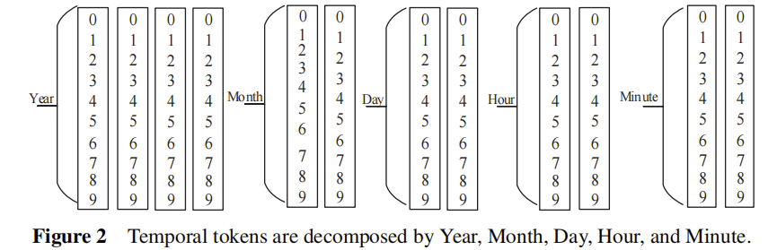 该阶段旨在将时空信息分解为时间标记的序列。对于这个阶段,第一个挑战是如何将时间和空间信息分解成标记。第二个挑战是如何选择总标记的数量。研究[23]提出了一种新方法,将时间信息分解为32个标记,然而,存在两个问题。第一个是它仅处理年、月和日,忽略了更细粒度的时间信息,例如分钟和秒。为了改进,本文采用1到12的标记表示月份,且与月份标记一致,其他日期标记仍为0到9。因此,本文提出了一种新的方法,将时间信息分解为五个部分,包括年、月、日、小时和分钟。每个部分可以用十个不同的标记表示(即0到9),如图2所示。