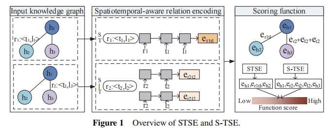 与以往忽略空间信息的研究不同,本文提出了两种模型,分别为STSE和S-TSE,它们将时空信息融入到事实中。首先,这两种模型利用LSTM模型捕捉顺序数据,即关系、时间标记和空间标记。接着,为了提高可用性,这两种模型应用现有的静态KGC评分函数来评估事实的合理性。具体而言,提出模型的概述如图1所示。从图1可以看出,STSE和S-TSE有两个主要组成部分,即关系编码和评分函数。对于关系编码阶段,STSE假设关系、时间信息和位置信息是不可分的。因此,它将空间和时间信息整合到关系中。具体来说,它通过LSTM模型依次处理关系、时间信息和位置。另一种模型,S-TSE,假设时间信息和位置信息是独立的。因此,S-TSE利用两个LSTM模型分别对空间感知关系和时间感知关系进行编码。对于评分函数,基于TransE模型【9】,我们为两个模型设计了不同的评分函数。