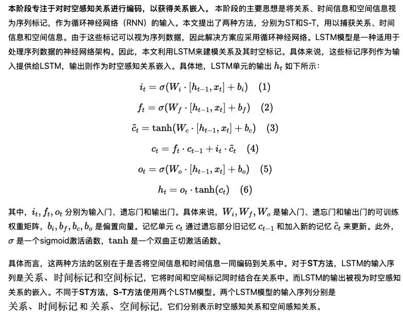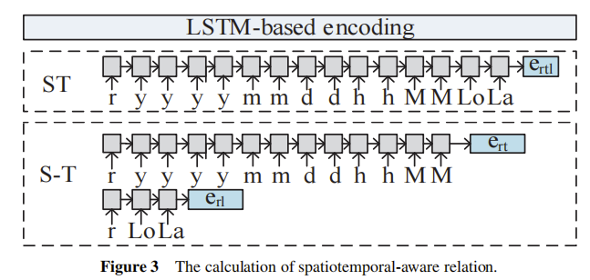 对于第一阶段,这两种方法将空间和时间信息分解为时空标记的序列。对于第二阶段,这两种方法利用不同的方式对关系进行编码。具体而言,ST假设关系、时间信息和位置信息是不可分的。因此,它将空间和时间信息结合到关系中。具体来说,它通过LSTM模型处理关系、时间信息和位置信息。另一种模型,S-T,假设时间信息和位置是独立地影响关系。因此,S-T利用两个LSTM模型分别对时空感知关系和时空独立关系进行编码。每种方法的两个阶段的详细描述如下: