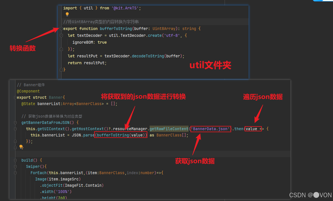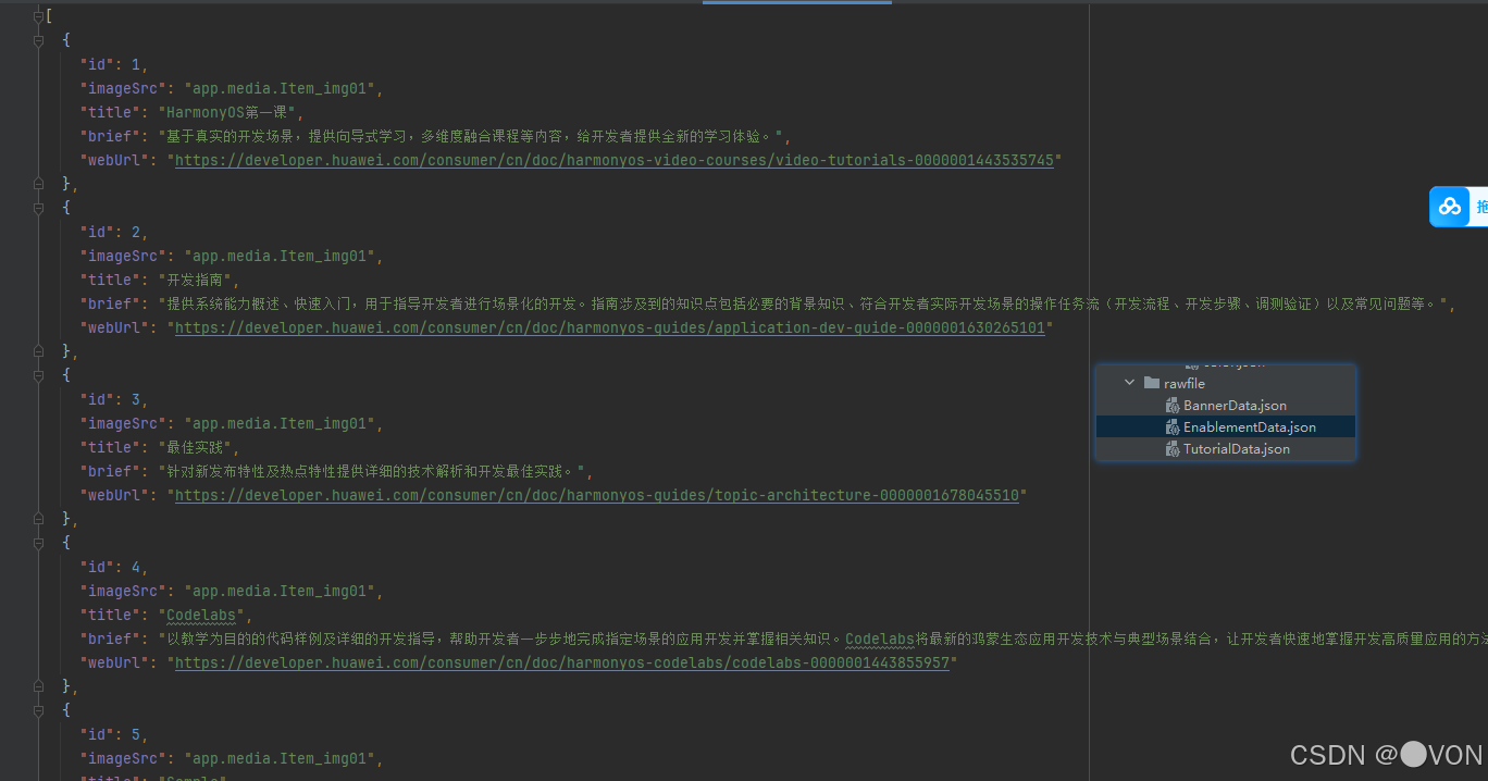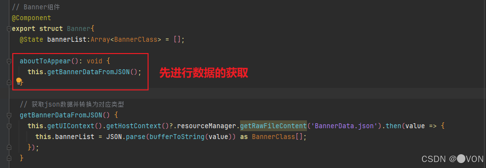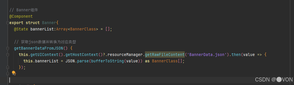 接下来引用json数据先定义一个方法getBannerDataFromJson(),并通过ResourceManager获取当前工程目录下rawfile中的json文件内容。