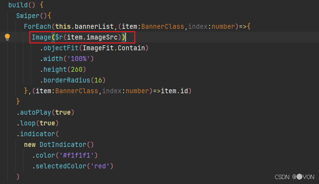 export struct Banner{@State bannerList:Array<BannerClass> = [];aboutToAppear(): void {this.getBannerDataFromJSON();}// 获取json数据并转换为对应类型getBannerDataFromJSON() {this.getUIContext().getHostContext()?.resourceManager.getRawFileContent('BannerData.json').then(value => {this.bannerList = JSON.parse(bufferToString(value)) as BannerClass[];});}build() {Swiper(){ForEach(this.bannerList,(item:BannerClass,index:number)=>{Image($r(item.imageSrc)).objectFit(ImageFit.Contain).width('100%').height(260).borderRadius(16)},(item:BannerClass,index:number)=>item.id)}.autoPlay(true).loop(true).indicator(new DotIndicator().color('#f1f1f1').selectedColor('red'))}