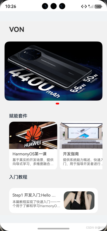 struct Index {@State message: string = 'VON';build() {Column(){Text(this.message).fontSize(24).fontWeight(700).width('100%').padding({left:16}).lineHeight(33).textAlign(TextAlign.Start)Scroll(){Column(){Banner()EnablementView()TutorialView()}}.layoutWeight(1).scrollBar(BarState.Off).align(Alignment.TopStart)}.height('100%').width('100%').backgroundColor('#f1f1f1').padding({top:11,left:16,right:16});}