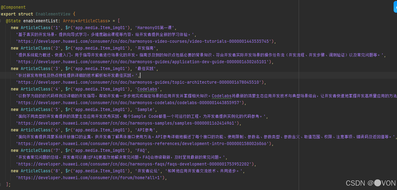 export struct EnablementView {@State enablementList: Array<ArticleClass> = [];aboutToAppear(): void {this.getEnablementDataFromJSON();}// 获取json数据并转换为对应类型getEnablementDataFromJSON() {this.getUIContext().getHostContext()?.resourceManager.getRawFileContent('EnablementData.json').then(value => {this.enablementList = JSON.parse(bufferToString(value)) as ArticleClass[];});}build() {Column(){Text('赋能套件').fontColor('#182431').fontSize(16).fontWeight(500).fontFamily('HarmonyHeiTi-medium').textAlign(TextAlign.Start).padding({ left: 16 }).margin({ bottom: 8.5 })Grid() {ForEach(this.enablementList, (item: ArticleClass) => {GridItem() {EnablementItem({ enablementItem: item })}}, (item: ArticleClass) => item.id)}.rowsTemplate('1fr').columnsGap(8).scrollBar(BarState.Off).height(169).padding({ top: 2, left: 16, right: 16 })}.margin({top:18}).alignItems(HorizontalAlign.Start).width('100%')}