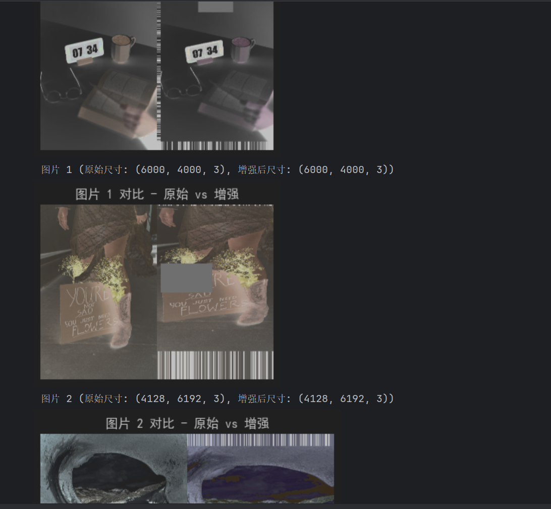 for idx, (original, augmented) in enumerate(zip(images_different_sizes, images_aug)):print("图片 %d (原始尺寸: %s, 增强后尺寸: %s)" % (idx, original.shape, augmented.shape))# 将两张图横向拼接在一起以便对比comparison = np.hstack([original, augmented])# 使用matplotlib显示图像plt.figure(figsize=(15, 10)) # 设置显示窗口大小plt.title(f"图片 {idx} 对比 - 原始 vs 增强") # 设置图像标题plt.imshow(comparison) # 显示图像plt.axis('off') # 关闭坐标轴plt.show() # 展示图像