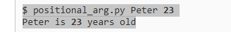 parser.add_argument('age')args = parser.parse_args()print(f'{args.name} is {args.age} years old')