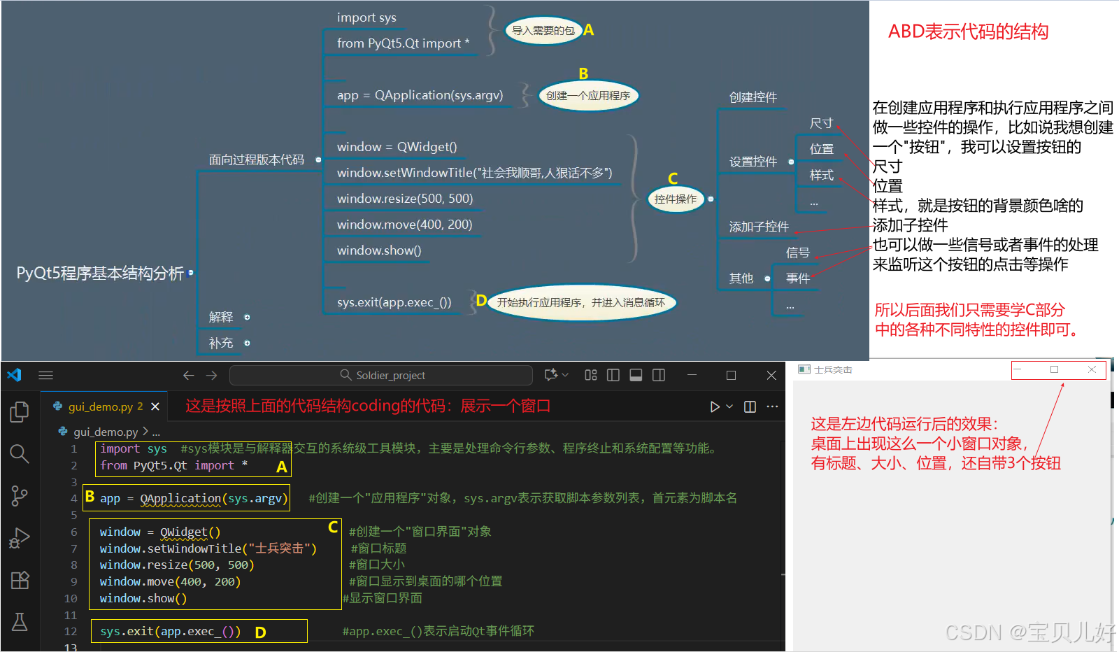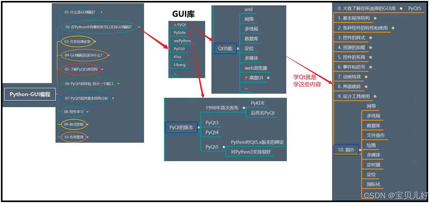 从宏观上看,目前比较流行的GUI编程是Qt框架。Qt是一个跨平台的C++ 框架,用于构建桌面应用程序。PyQt5是Python的图形用户界面(GUI)框架,其底层是Qt。也就是PyQt5是用python把Qt的全部接口又重新写了一遍而成的。