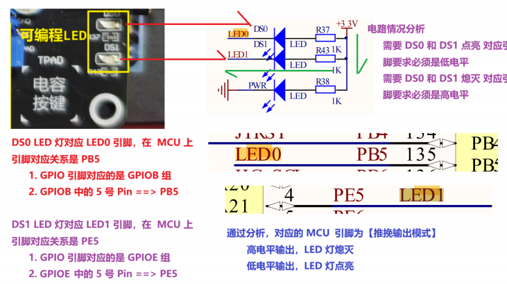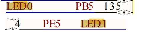 根据原理图分析,对应引脚是 PB5 和 PE5,对应工作模式为 GPIO 推挽输出模式。利用 GPIO 寄 存器对当前的 IO 引脚进行控制。