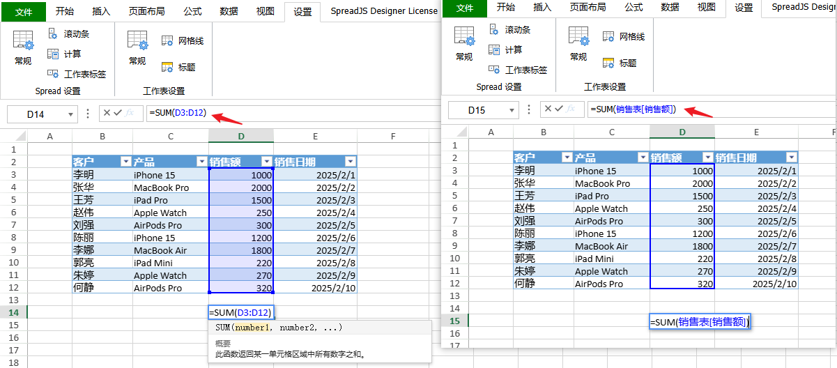 =SUM(D3:D12) → =SUM(销售表[销售额])