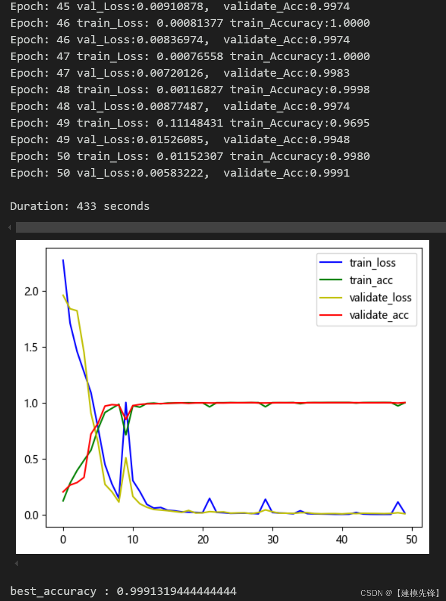 50个epoch,准确率99%,用VMD+Transformer-BiLSTM-CrossAttention网络分类效果显著,创新模型能够充分提取轴承故障信号的时序特征,收敛速度快,性能优越,精度高,交叉注意力机制能够对不同特征之间的关联程度进行建模,从故障信号特征中提取出对模型识别重要的特征,效果明显,创新度高!