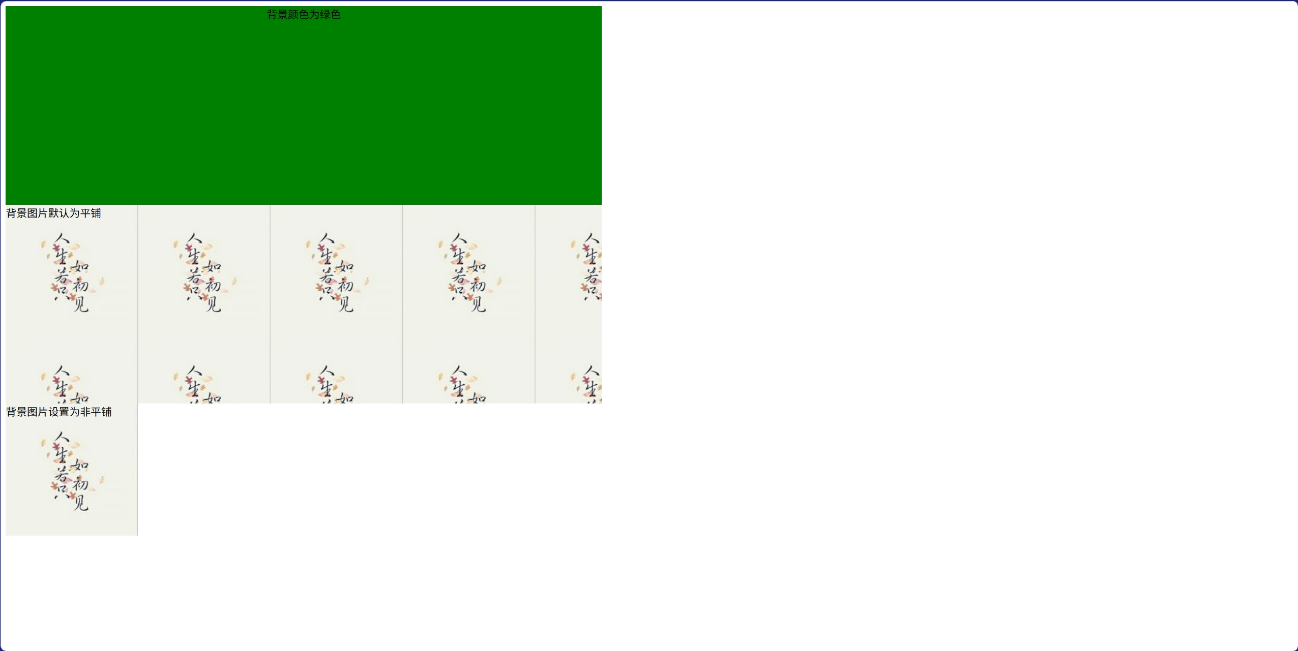 <body><!-- 设置背景颜色 --><div class="smallbox bkcolor"> 背景颜色为绿色</div><!-- 设置背景图片及平铺方式 --><div class="smallbox photo1">背景图片默认为平铺</div><div class="smallbox photo2">背景图片设置为非平铺</div>