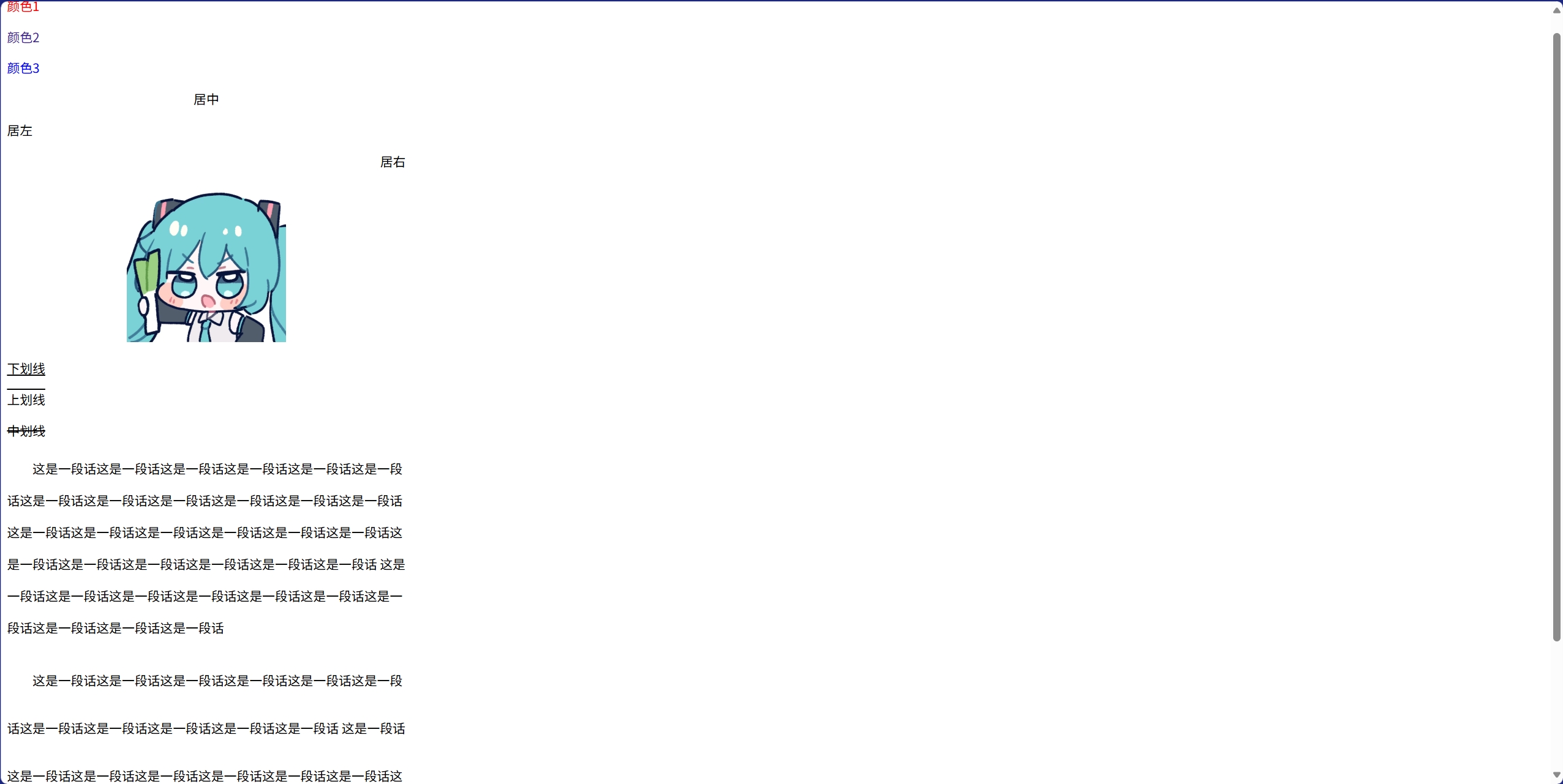 <body><div class="box"><!-- 设置文本颜色 --><p class="color1">颜色1</p><p class="color2">颜色2</p><p class="color3">颜色3</p><!-- 设置文本对齐 --><p class="align1">居中</p><p class="align2">居左</p><p class="align3">居右</p><p class="jpg"><img src="../img/初音表情包10.jpg" alt="图片加载失败" width="200px" height="200px"></p><!-- 设置下划线 --><p class="text-decoration1">下划线</p><p class="text-decoration2">上划线</p><p class="text-decoration3">中划线</p><!-- 文本缩进 --><!-- 行高 --><p class="p p1">这是一段话这是一段话这是一段话这是一段话这是一段话这是一段话这是一段话这是一段话这是一段话这是一段话这是一段话这是一段话这是一段话这是一段话这是一段话这是一段话这是一段话这是一段话这是一段话这是一段话这是一段话这是一段话这是一段话这是一段话这是一段话这是一段话这是一段话这是一段话这是一段话这是一段话这是一段话这是一段话这是一段话这是一段话</p><p class="p p2">这是一段话这是一段话这是一段话这是一段话这是一段话这是一段话这是一段话这是一段话这是一段话这是一段话这是一段话这是一段话这是一段话这是一段话这是一段话这是一段话这是一段话这是一段话这是一段话这是一段话这是一段话这是一段话这是一段话这是一段话这是一段话这是一段话这是一段话这是一段话这是一段话这是一段话这是一段话这是一段话这是一段话这是一段话</p></div>