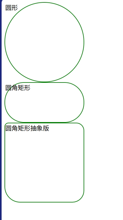 <head><meta charset="UTF-8"><meta name="viewport" content="width=device-width, initial-scale=1.0"><title>Document</title><style>.circle {width: 200px;height: 200px;border: 2px solid green;border-radius: 100px;/* 或者用 50% 表示宽度的一半 */border-radius: 50%;}.scircle {width: 200px;height: 100px;border: 2px solid green;border-radius: 50px;}</style>