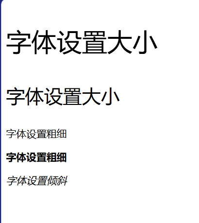 <body><div><p class="size1">字体设置大小</p><p class="size2">字体设置大小</p><p class="weight1">字体设置粗细</p><p class="weight2">字体设置粗细</p><p class="style"> 字体设置倾斜 </p></div>