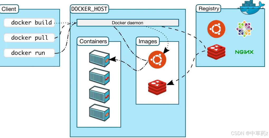 是存储和分发 Docker 镜像的中心仓库(类似 “代码仓库”)。官方公共仓库是 Docker Hub(图中可见 Ubuntu、NGINX 等镜像标识),也支持私有仓库部署。