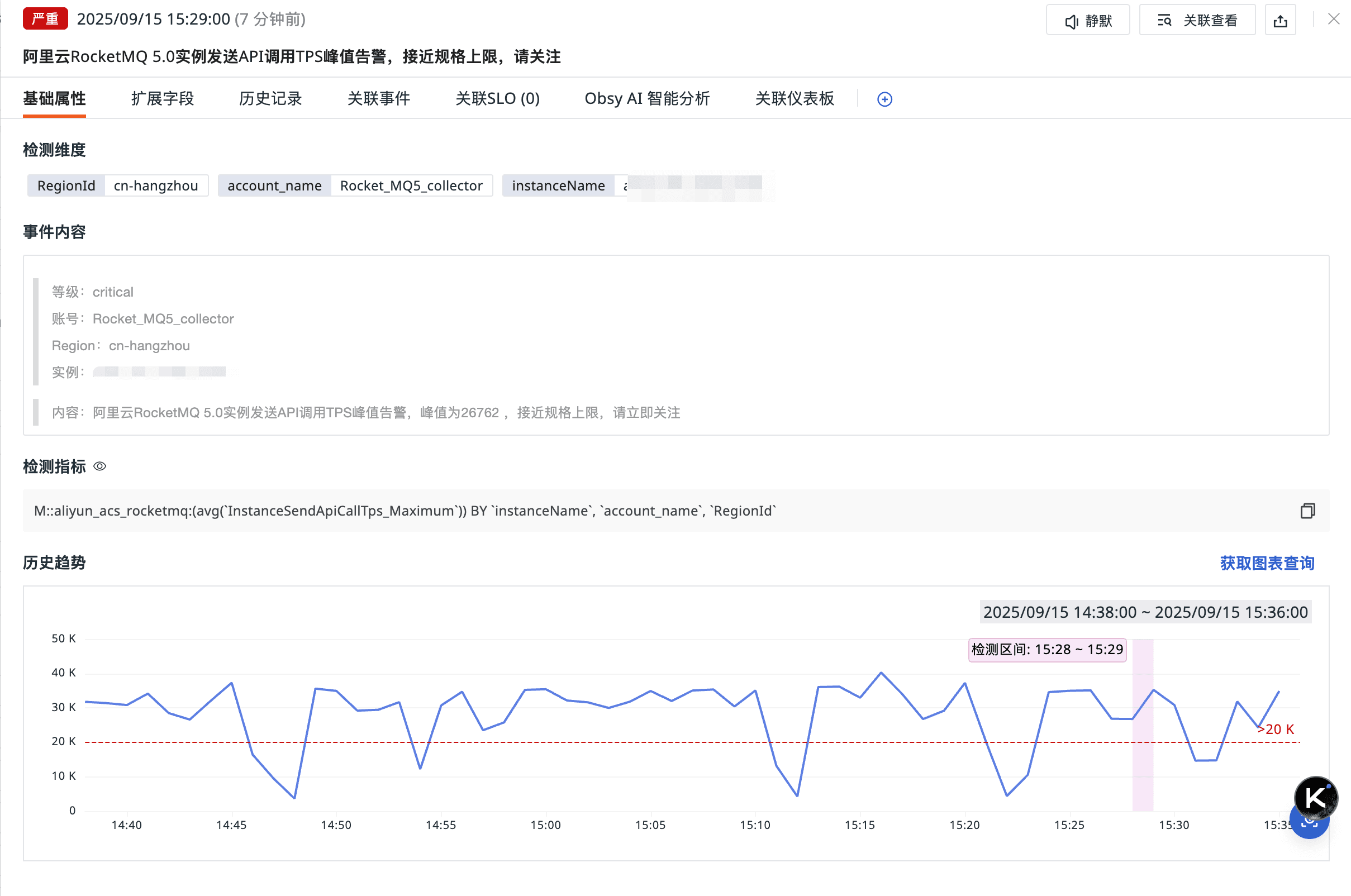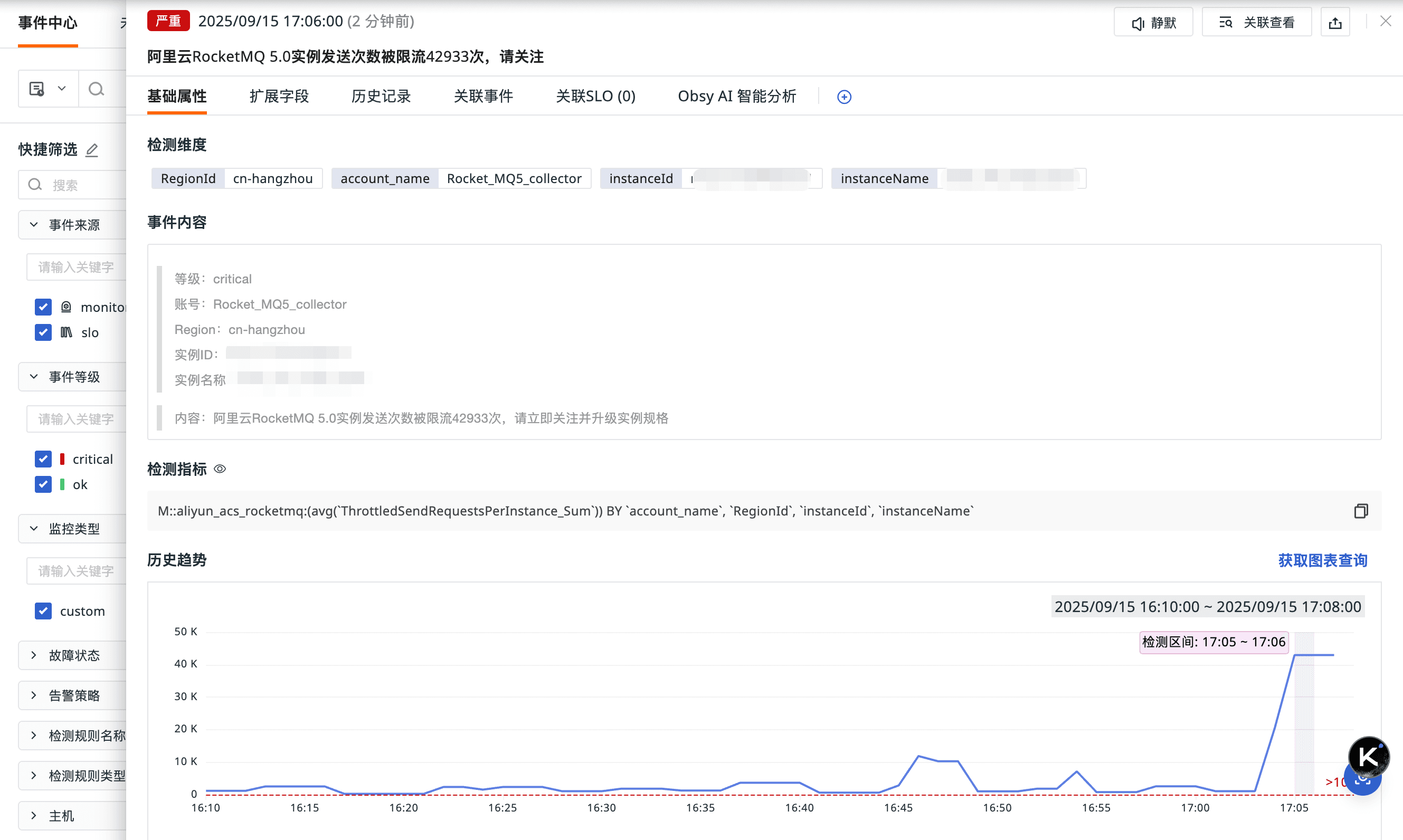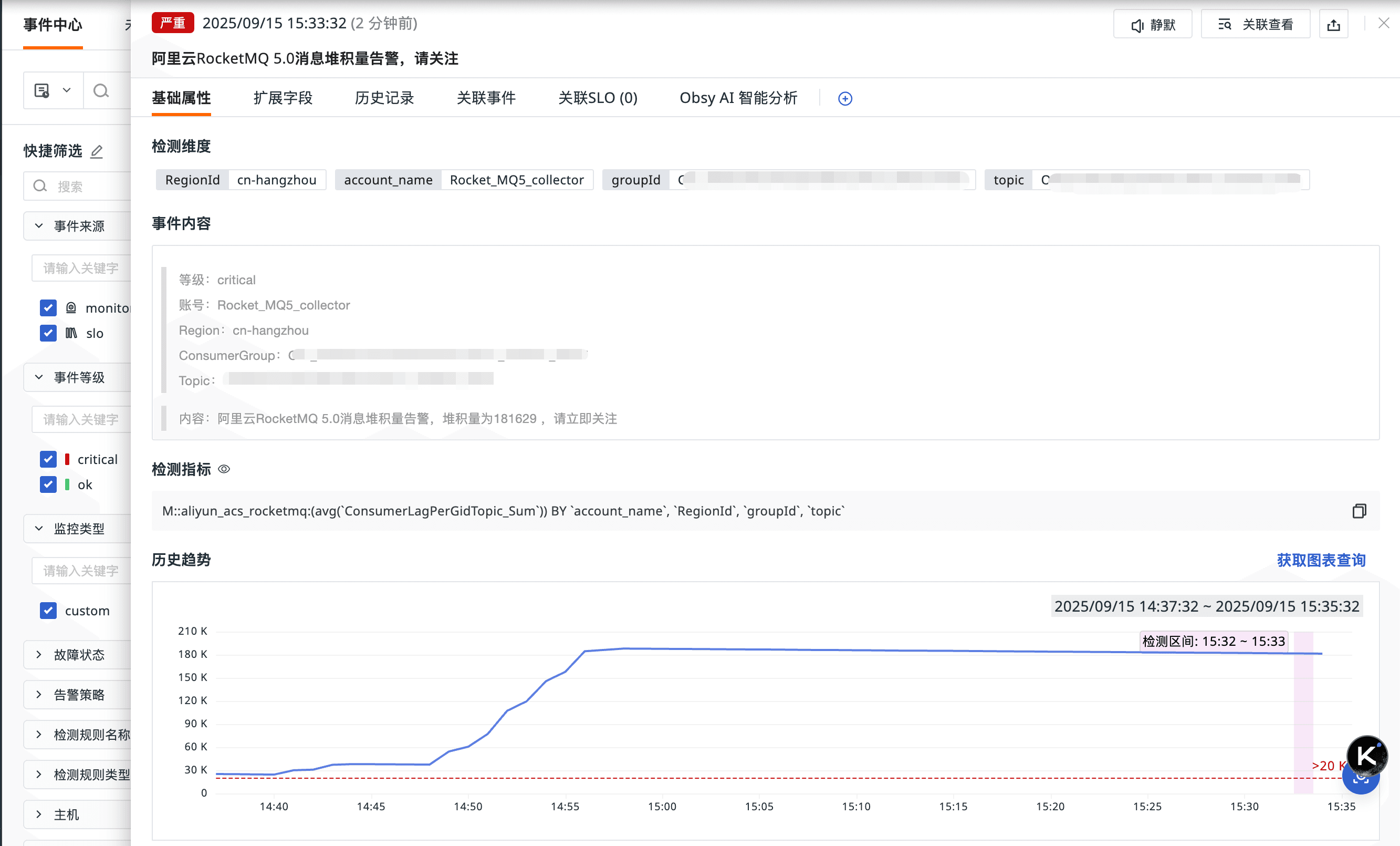 通过将阿里云 RocketMQ 5.0 的原生监控数据集成到观测云平台,用户可以实现更全面、更高效的数据监控与分析。观测云作为一个强大的可观测性平台,能够将阿里云 RocketMQ 5.0 监控数据与自身丰富的数据处理和可视化能力相结合。用户不仅可以实时查看 RocketMQ 5.0 的运行状态,如消息堆积、发送调用API峰值超过阈值、限流等关键指标,还可以通过观测云的智能告警功能,快速发现并响应潜在的性能问题或异常情况。此外,观测云支持多种数据源的整合,能够将 RocketMQ 5.0 数据与其他云服务或本地应用的监控数据进行关联分析,帮助用户从全局视角洞察系统的健康状况,从而更好地优化资源配置、提升系统稳定性,并为后续的运维决策提供有力支持。