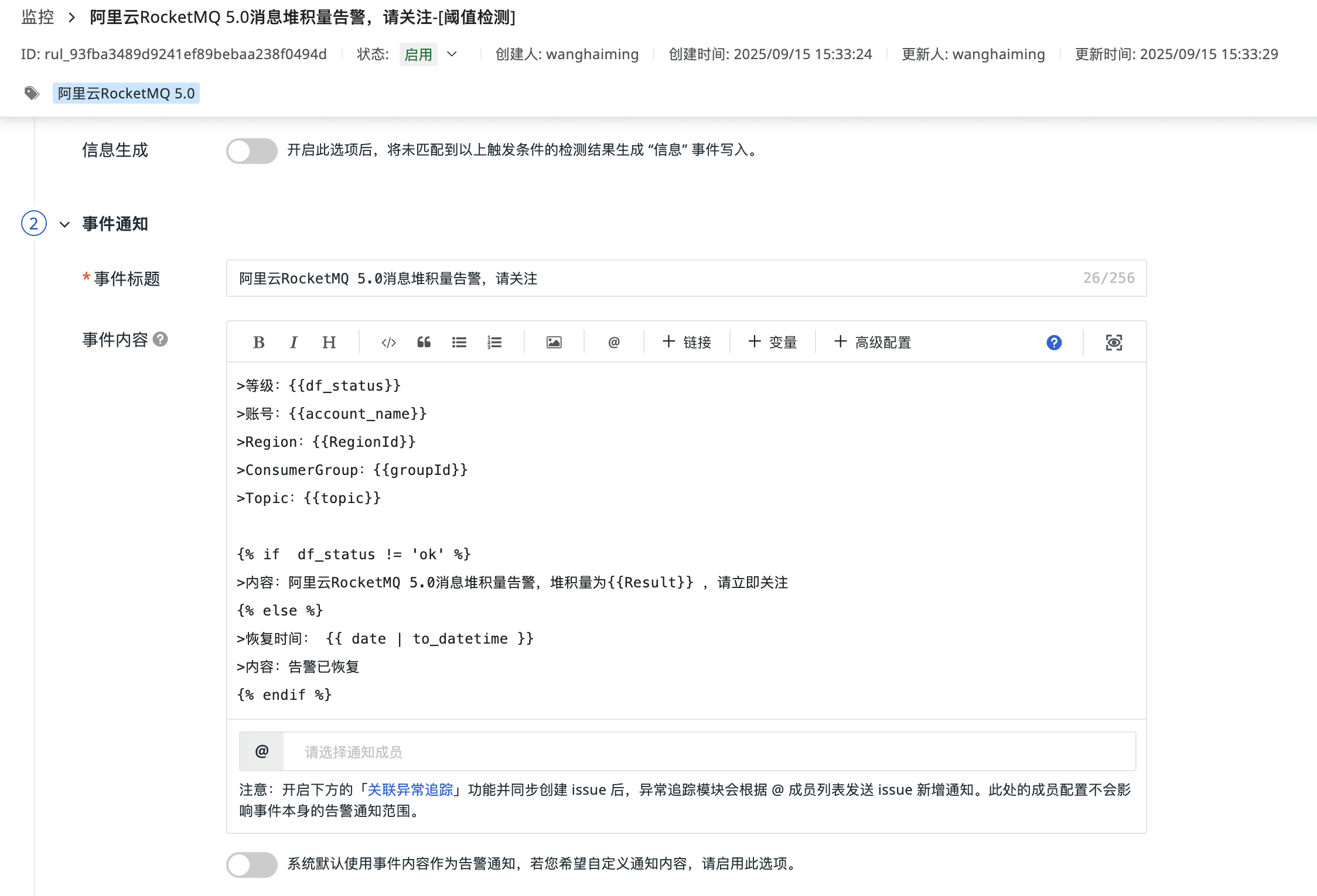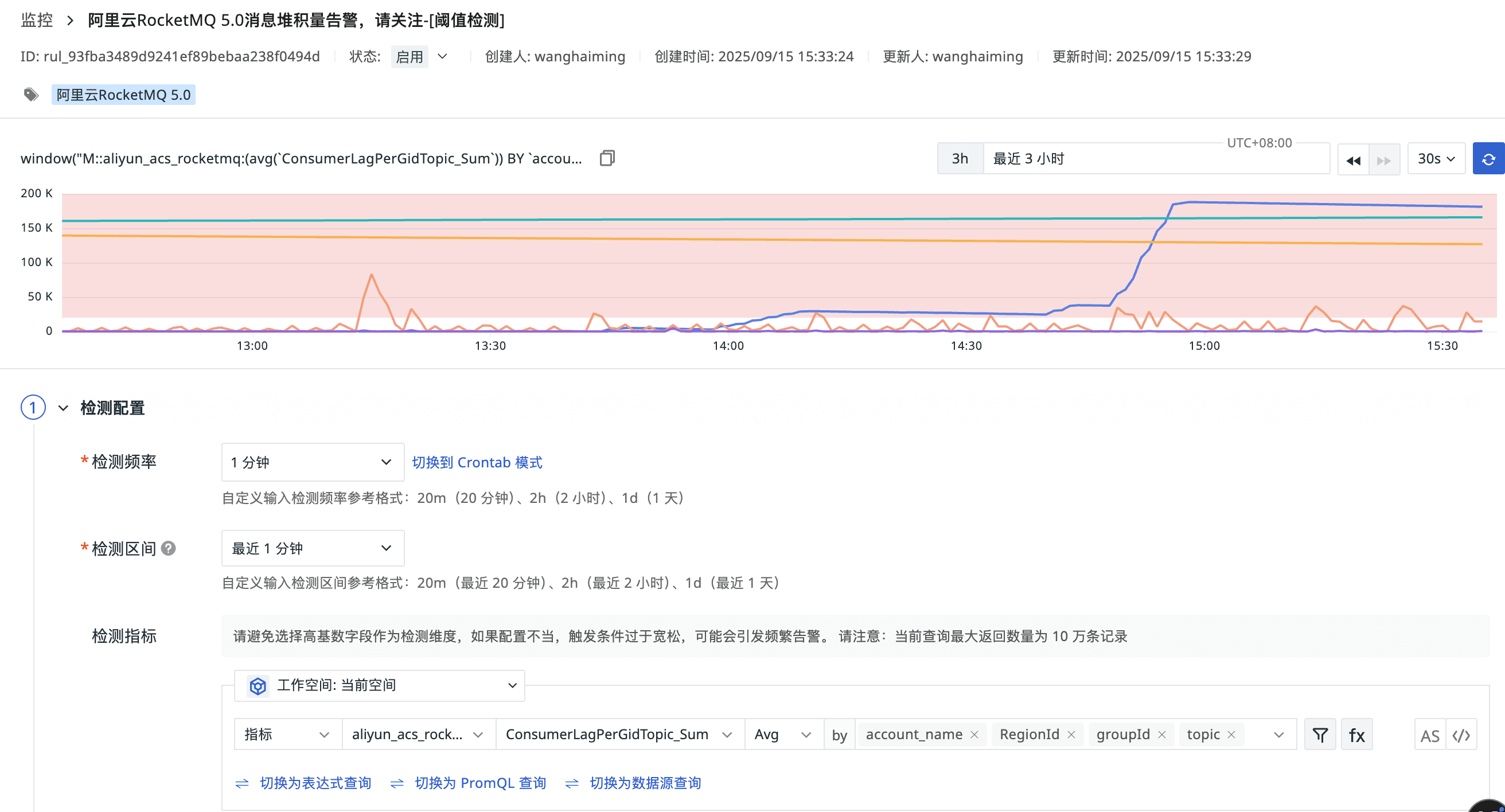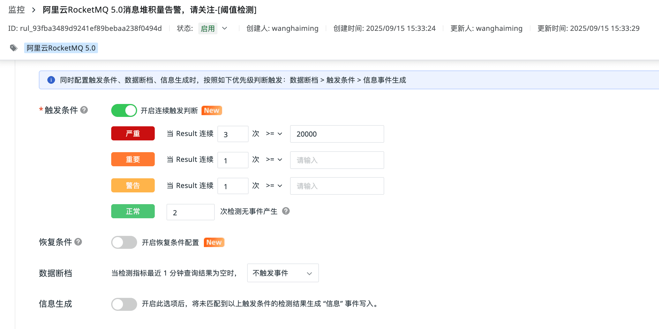 简要描述:云消息队列 RocketMQ 版支持按照ConsumerGroup粒度监控消息堆积量,可以用来预警下游消费堆积故障场景。业务侧上线后根据可容忍的经验评估报警阈值。