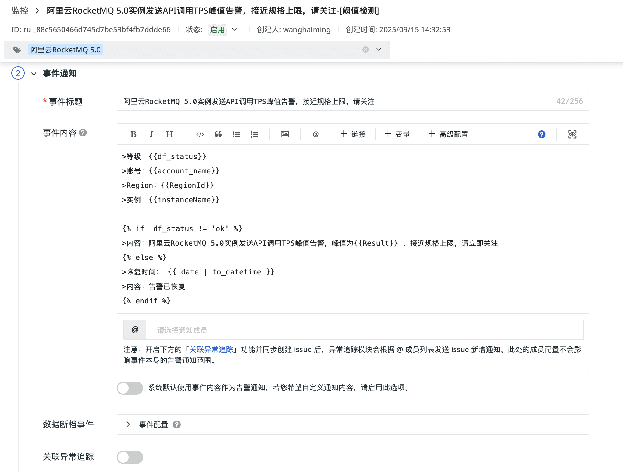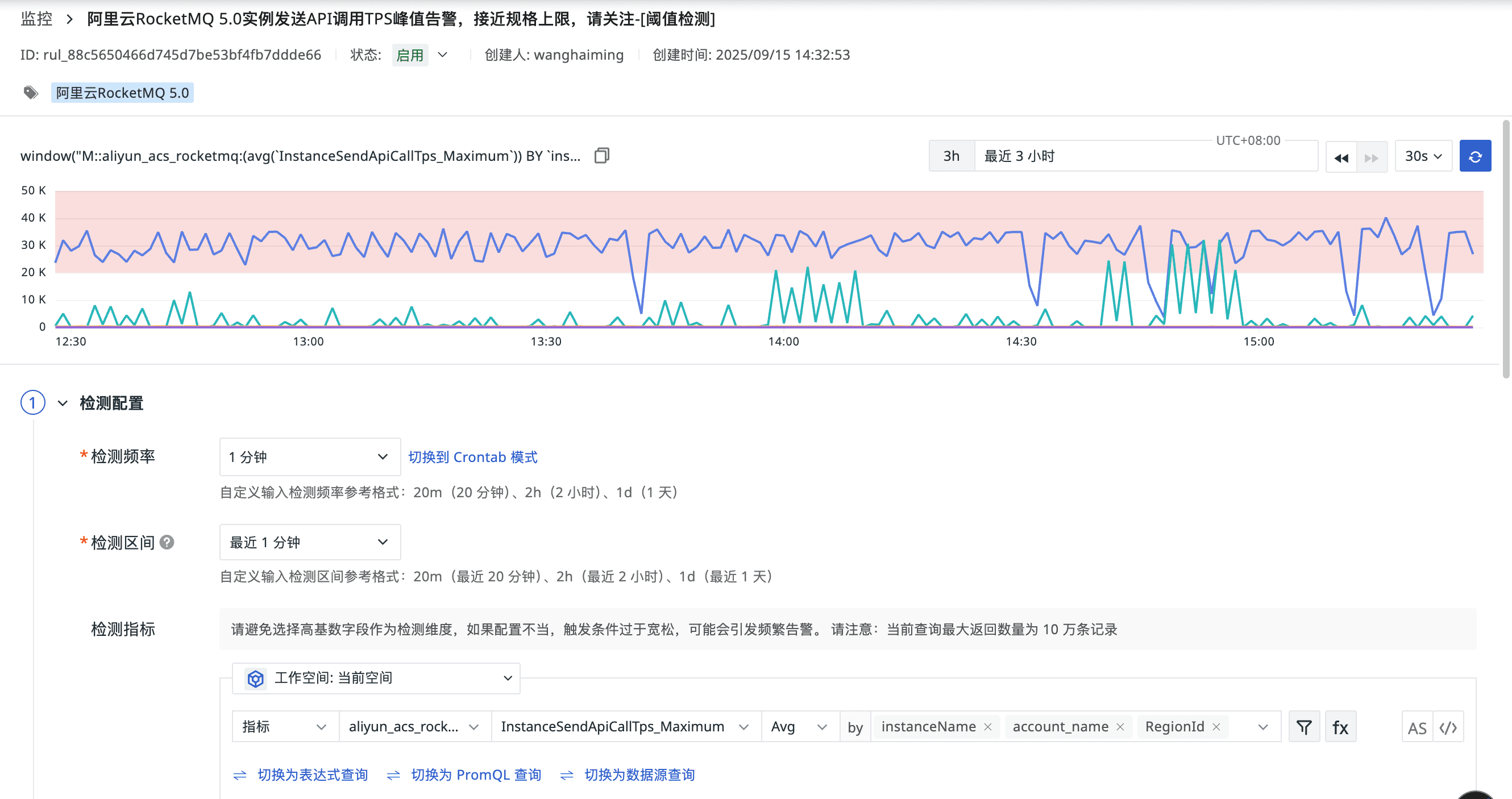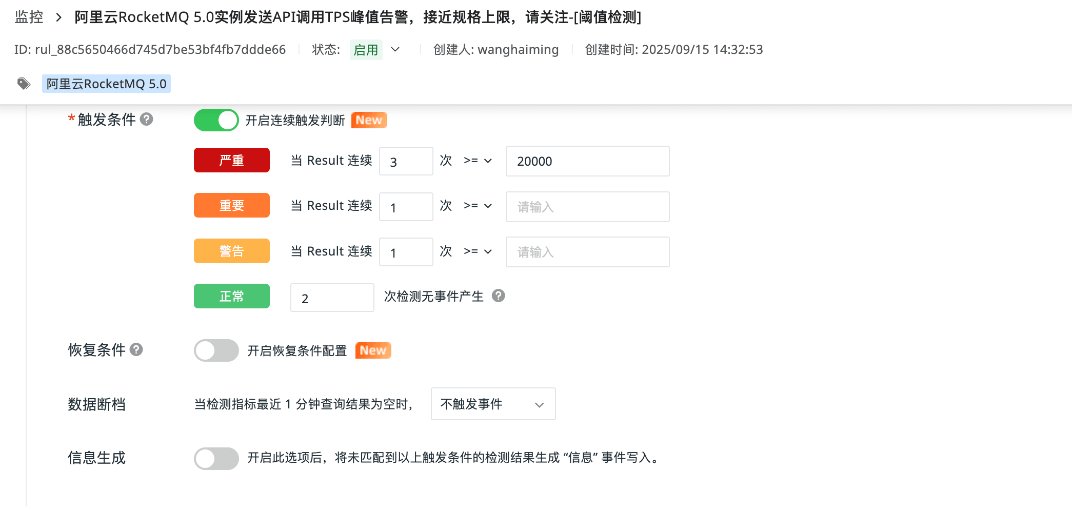 简要描述:RocketMQ 版 5.0实例规格明确规定了消息收发基础规格TPS上限,即消息收发API调用频率。若实例消息收发API调用TPS峰值超过规格限制,会导致实例被限流。阿里云建议设置为实例发送TPS峰值上限的70%。例如消息发送TPS峰值上限为5000,则阈值设置为3500。