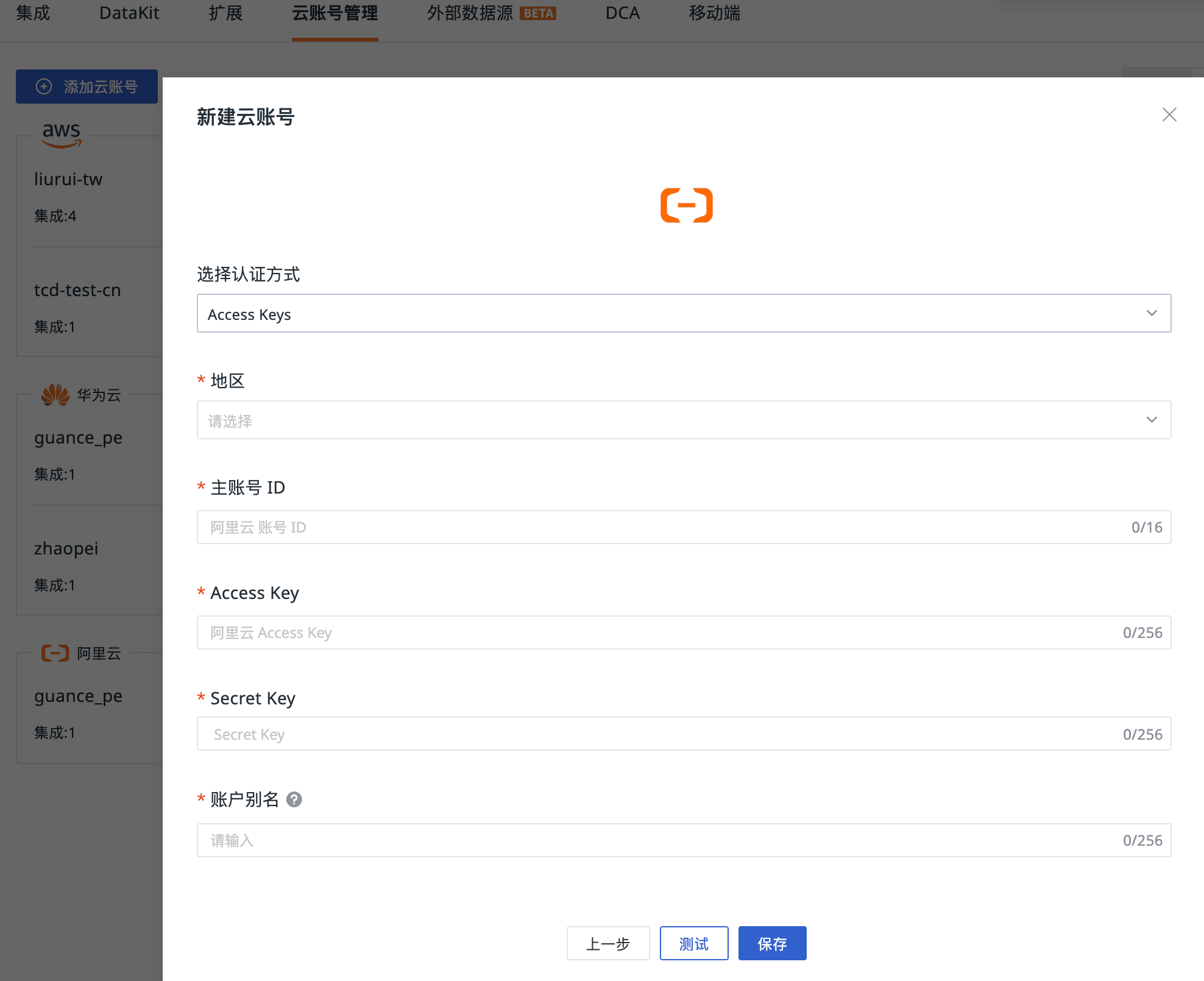 - 点击【添加云账号】,选择【阿里云】,填写界面所需的信息,如之前已配置过云账号信息,则忽略此步骤