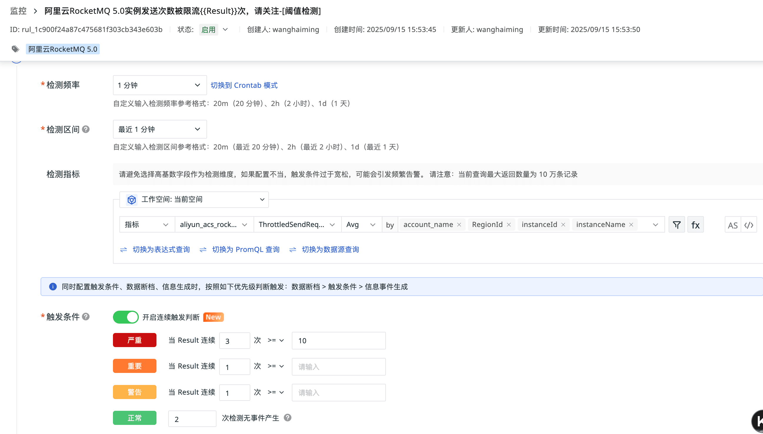 简要描述:云消息队列 RocketMQ 版支持将指定实例触发限流的事件作为监控项,通过对限流次数的监控,可以帮助您了解当前业务的受损情况。业务侧上线后根据可容忍的经验评估报警阈值。