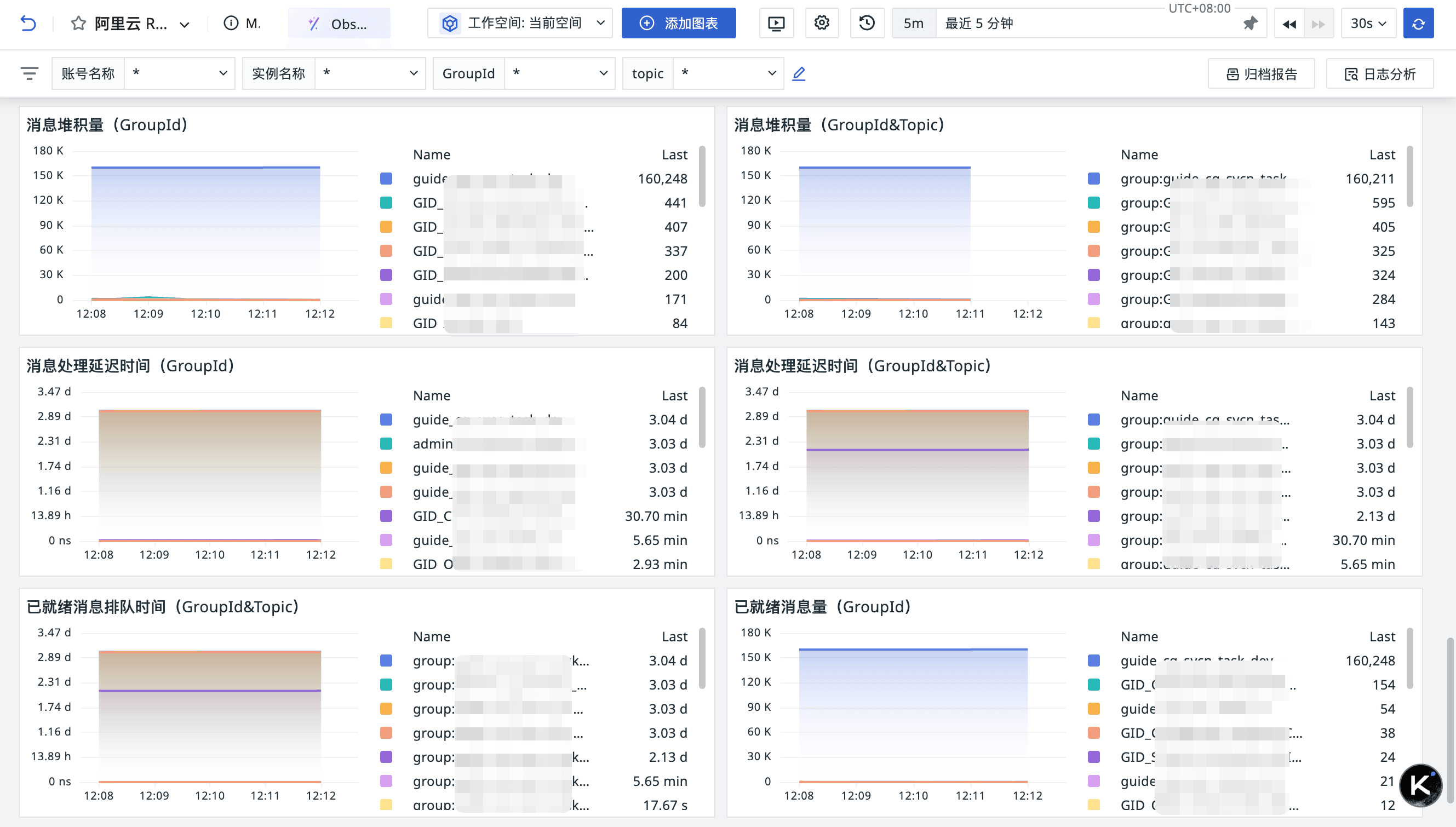 已就绪消息排队时间(GroupId&Topic) | ReadyMessageQueueTimePerGidTopic | Max | ms |