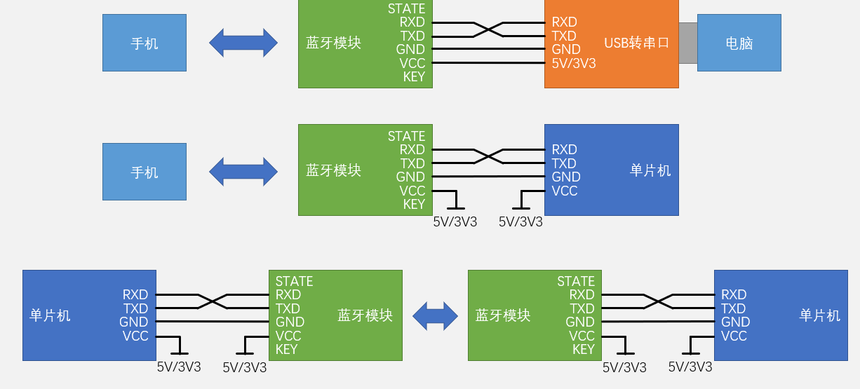 第一种连接不需要单片机,不需要写程序,可以对蓝牙模块通信测试和配置,可以验证蓝牙模块的好坏。