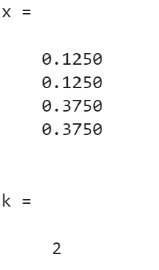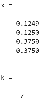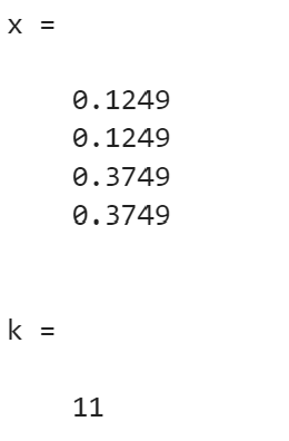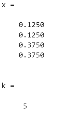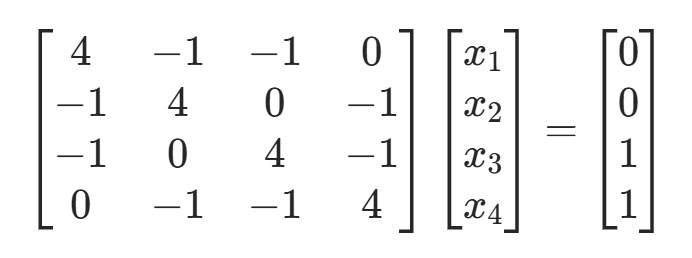 >> A = [4,-1,-1,0; -1,4,0,-1; -1,0,4,-1; 0,-1,-1,4]; b = [0,0,1,1]'; ep = 1e-4;