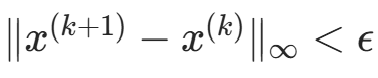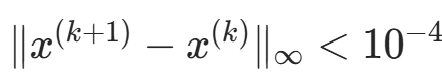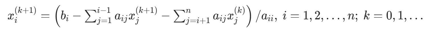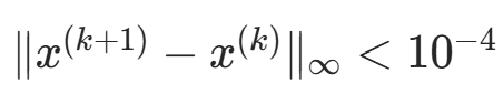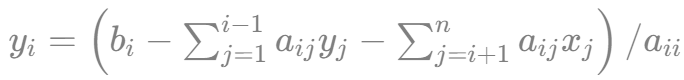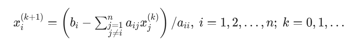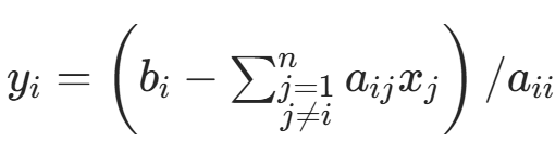 while k <= it_maxy(1) = (b(1) - A(1,2:n) * x(2:n)) / A(1,1);for i = 2:n-1y(i) = (b(i) - A(i,1:i-1) * y(1:i-1) - A(i,i+1:n) * x(i+1:n)) / A(i,i);endy(n) = (b(n) - A(n,1:n-1) * y(1:n-1)) / A(n,n);if norm(y - x, inf) < epbreak; endk = k + 1; x = y;
