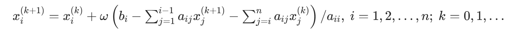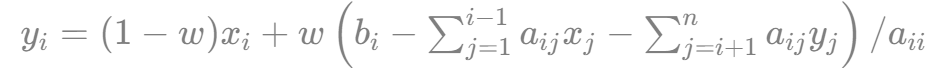 while k <= it_maxy(1) = (1 - w) * x(1) + w * (b(1) - A(1,2:n) * x(2:n)) / A(1,1);for i = 2:n-1y(i) = (1 - w) * x(i) + w * (b(i) - A(i,1:i-1) * y(1:i-1) - A(i,i+1:n) * x(i+1:n)) / A(i,i);endy(n) = (1 - w) * x(n) + w * (b(n) - A(n,1:n-1) * y(1:n-1)) / A(n,n);if norm(y - x, inf) < epbreak; endk = k + 1; x = y;