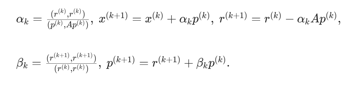 for k = 1:nAp = A * p0; alf = r0n2 / (p0' * Ap); x1 = x + alf * p0; r1 = r0 - alf * Ap;if norm(r1, inf) < epx = x1; return;endif norm(x1 - x, inf) < epx = x1; return;endr1n2 = r1' * r1; beta = r1n2 / r0n2; p1 = r1 + beta * p0;x = x1; r0 = r1; p0 = p1; r0n2 = r1n2;