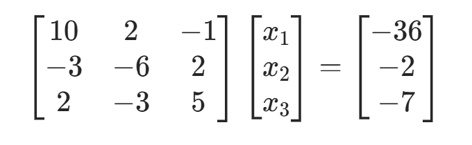 >> A = [10 2 -1; -3 -6 2; 2 -3 5]; b = [-36 -2 -7]'; ep = 1e-4;