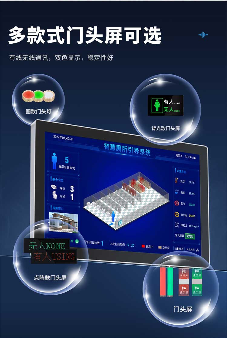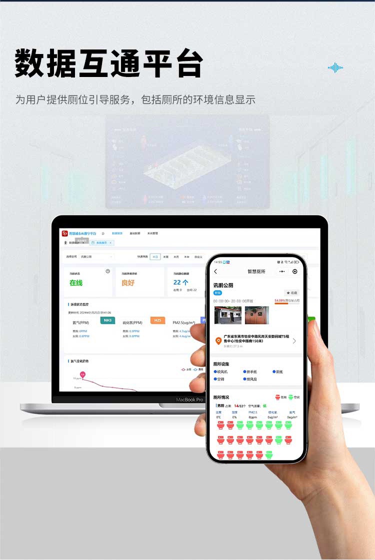 通过厕位有无人感应器,激光 / 毫米波 / 红外技术,精度 > 99%,实时监测厕位状态;环境监测传感器,温湿度、氨气、硫化氢等,采集空气质量数据;智能水电表记录能耗;客流统计摄像机统计人流量,为后续决策提供基础数据。