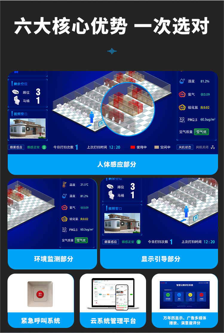 实现了用户体验升级,快速找厕、环境舒适;运维效率提升,故障预警、精准排班;节能环保优化,能耗监测、资源精准配置;安全保障强化,紧急呼叫、客流密度监测,四大价值,成为智慧城市公共服务的重要样本。