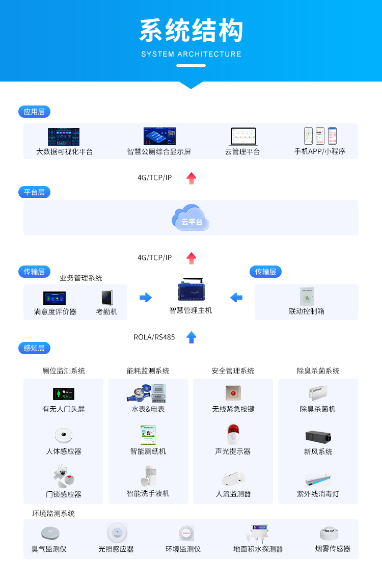 智慧公厕管理系统全流程智能化通过 “感知 - 传输 - 决策 - 执行” 的闭环架构实现,以云管理平台为核心,整合多终端设备与技术,覆盖从数据采集到智慧服务的全链路。