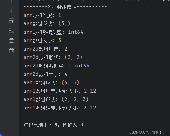 print("arr数组大小:", arr.size)print("arr2d数组维度:", arr2d.ndim)