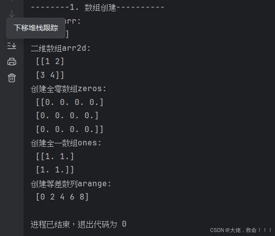 print("arr一维数组开方函数:\n", sqrt_arr)print("arr2d二维数组:\n", arr2d)