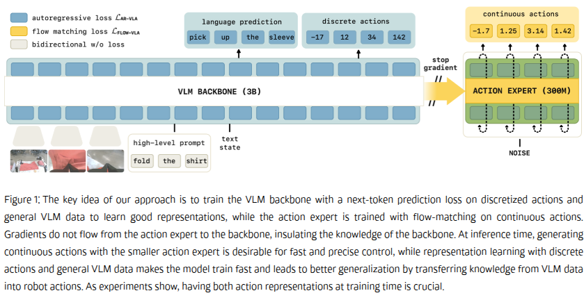 简单的说就是训练的时候动作专家模块的训练梯度与VLM训练梯度隔离,上图中右边动作专家算法模块的梯度不回传给VLM。