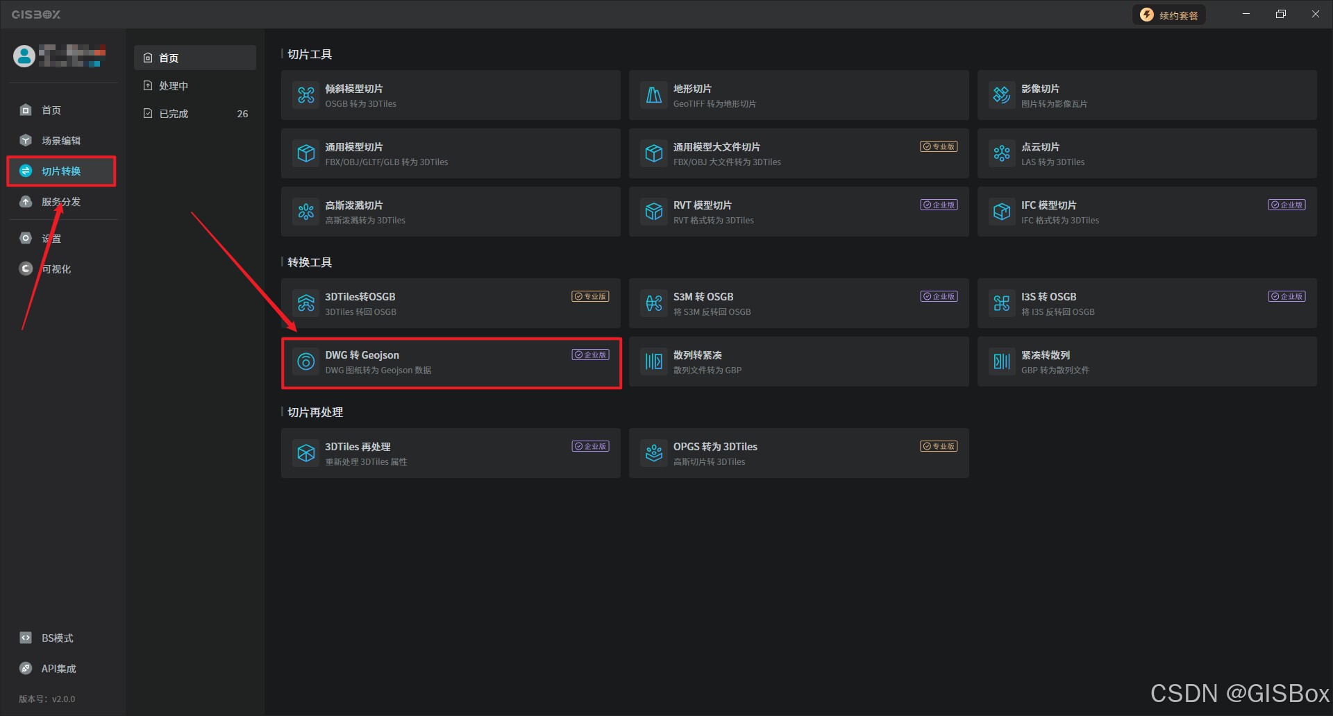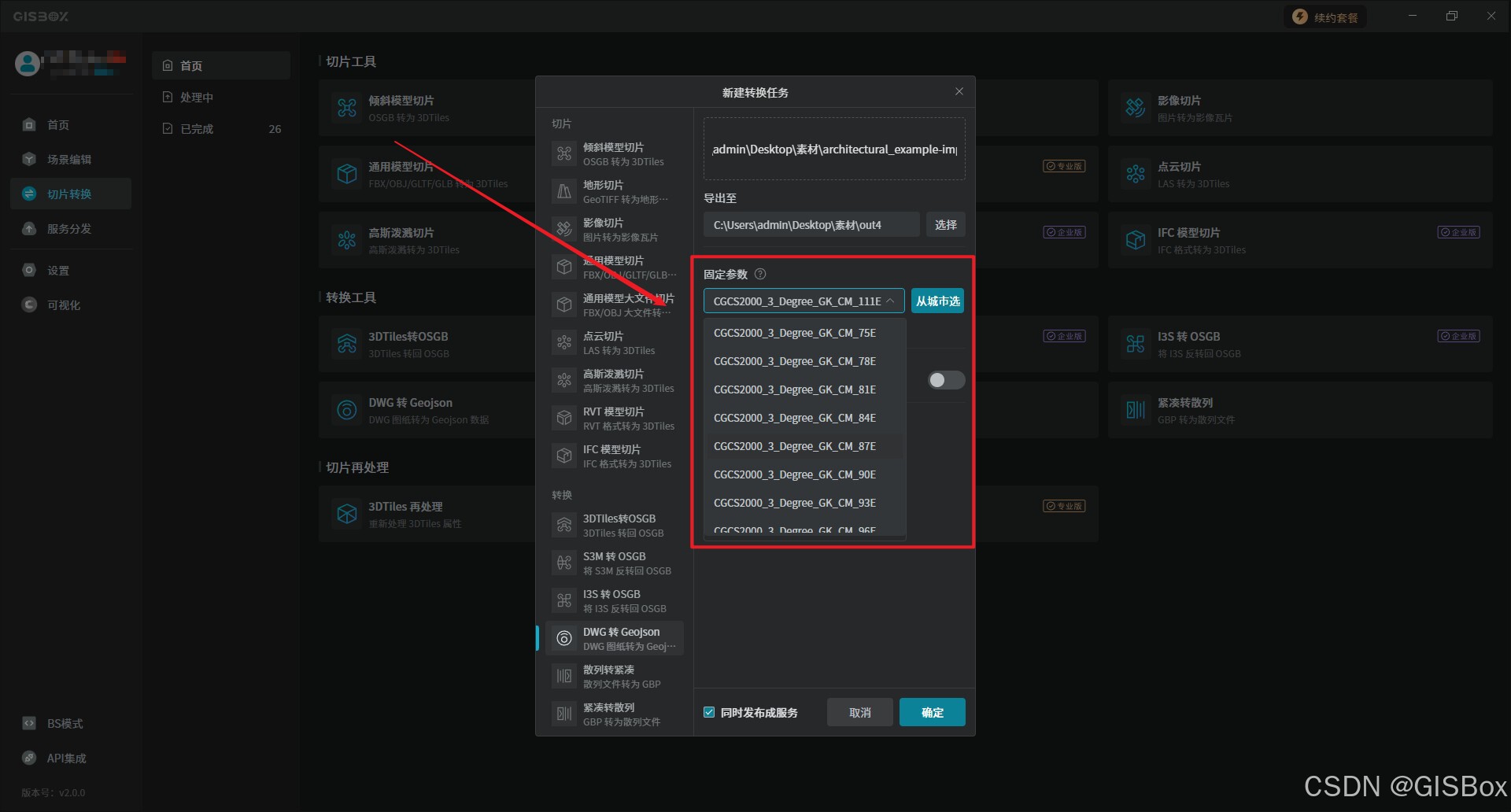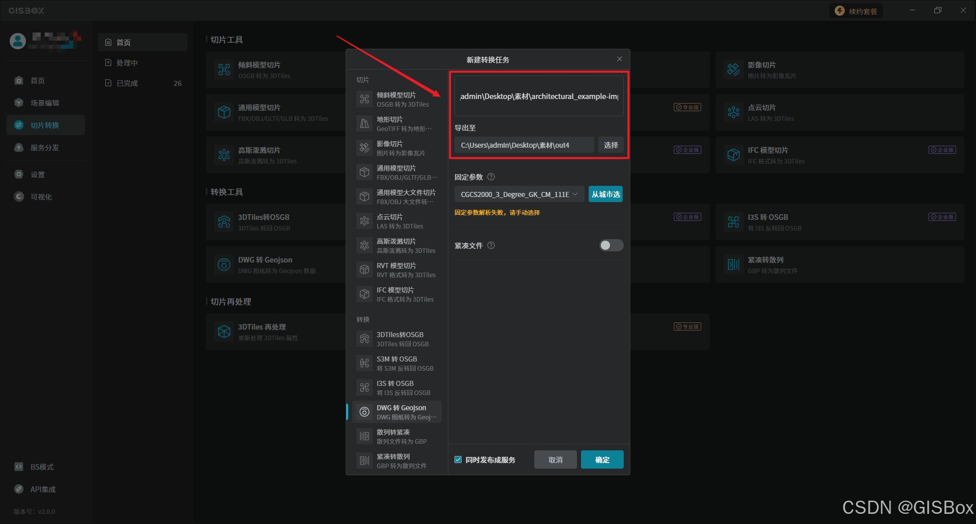 1、首先打开GISBox软件,点击“切片转换”在转换工具中选择“DWG转Geojson”,进行新建任务转换。